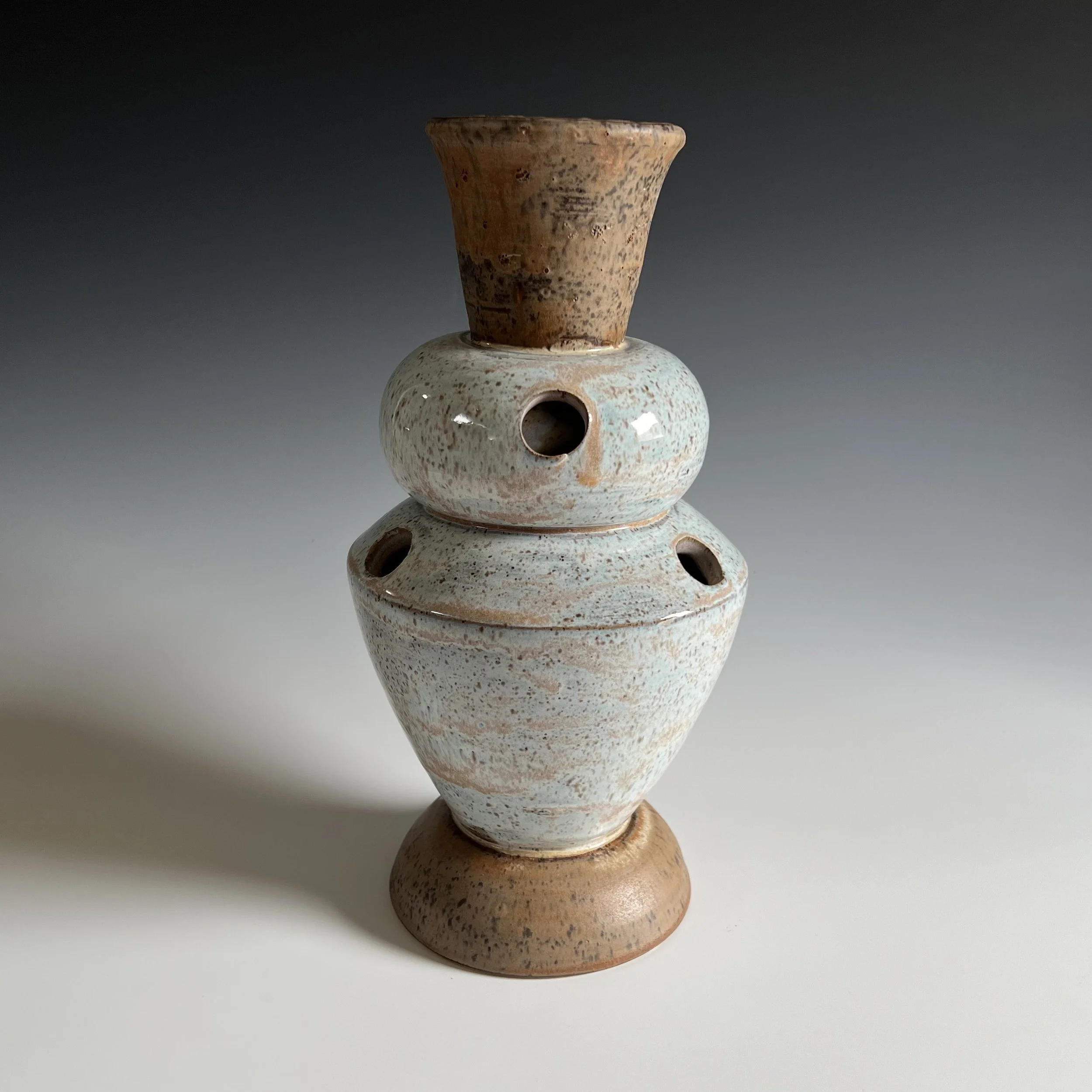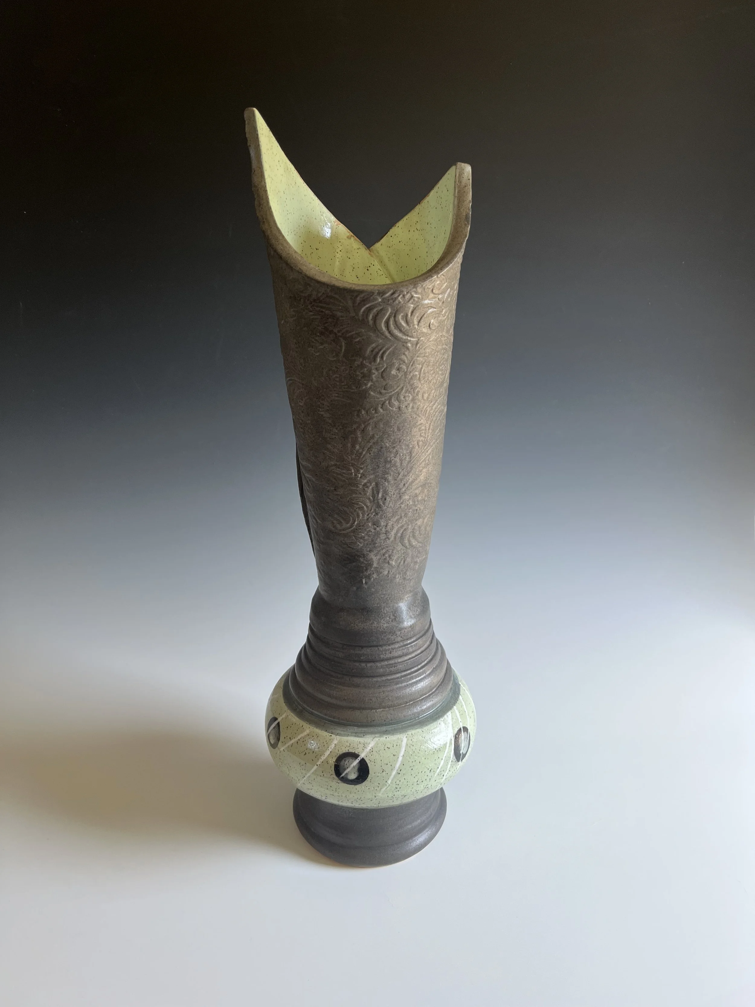For me, creating art—no matter the medium—is a way of restoring harmony, and offering permanence in an often disordered & ephemeral world. I strive to create a delicate sense of beauty and balance in the forms I create, often printing textures and shapes on my surfaces from leaves or sticks or grasses I come across on my daily walks along a creek and in a forest right outside my door. That leaf, and even the plant itself, will one day be gone just as we will be. But its unique texture or shape will remain a part of my pottery, or multi-media work, long after it disappears.